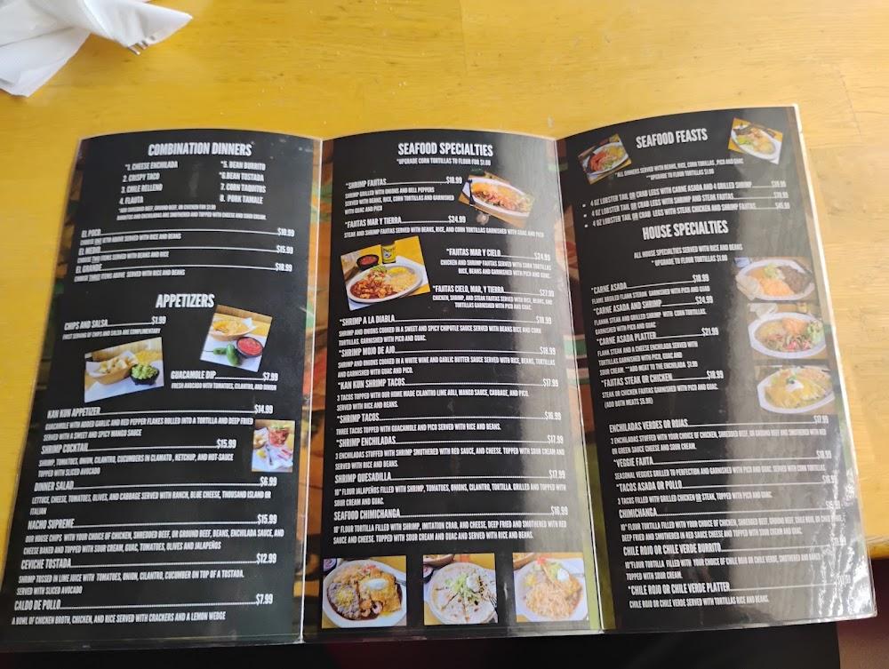 Kan Kun's menu dazzles with local specialties and classic Mexican favorites. From appetizers like guacamole dip to combination dinners featuring pork tamales, every dish bursts with flavor. The seafood specialties include a remarkable lobster tail that draws food lovers, too.